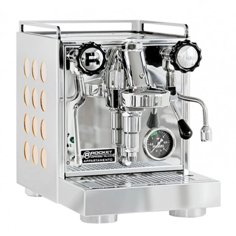 Die Rocket Appartamento Siebträgermaschine ist ideal für jeden, der wenig Platz, aber viel Freude an handwerklicher Kaffeezubereitung hat. Die klassisch gehaltene Siebträgermaschine besticht mit den runden Ausschnitten an der Seite und geht glatt als Design Element durch. Die Front ist ganz im Rocket Stil gehalten. Mit den großen Drehventilen, das linke mit dem Rocket R besetzt, der no-burn Dampflanze und dem massiven Siebträgerhalter macht die Appartamento einen äußerst professionellen Eindruck. Unterstrichen wird dieses Erscheinungsbild zusätzlich durch das Kesselmanometer, sowie dem Bezugshebel aus Edelstahl. Ein ECO-Modus kann aktiviert werden. Die hochwertige Kesselisolierung sorgt für eine optimale Wärmespeicherung sowie eine bessere Energie Effizienz.