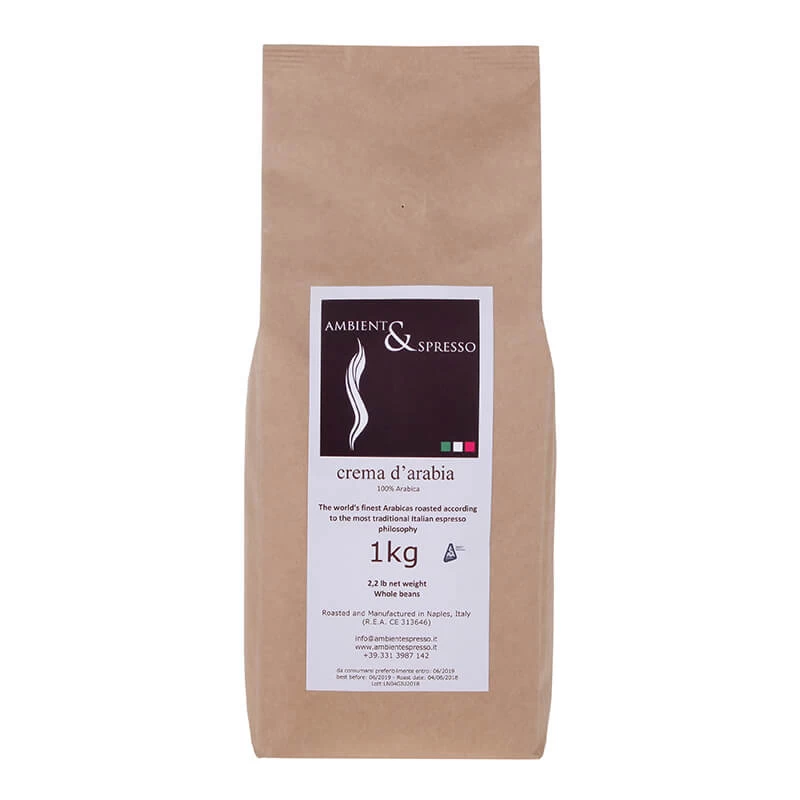 Mit dem Crema d´Arabia von Ambient&spresso füllt sich die Tasse mit intensiven Aromen und kraftvollem Geschmack. Die Röstung aus Napoli besteht zu 100 % aus Arabica Kaffeebohnen und wurde besonders schonend geröstet. Voll und intensiv im Geschmack wird der Espresso mit leicht fruchtigen Noten ergänzt. Ob im Vollautomaten, in der Siebträgermaschine oder im Mokkakännchen – die ganzen Bohnen der Crema d´Arabia lassen sich optimal zu einem köstlichen Kaffeemoment zubereiten.