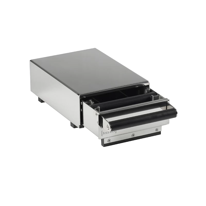 Die kleine Sudschublade Drawer exclusive SS von Joe Frex überzeugt nicht nur aufgrund des schlicht-eleganten Designs, sondern vor allem auch durch die geringe Höhe, wodurch sie sehr platzsparend ist. Der Abschlagbehälter ist aus massivem, rostfreiem Edelstahl gefertigt und erstrahlt in polierter Optik. Unteranderem aufgrund des dickwandigen Edelstahls, ist die Sudschublade besonderes langlebig und eignet sich hervorragend für zu Hause als auch in der Gastronomie. Ein sicherer Stand, sodass Sie sogar eine Mühle oder eine Maschine darauf platzieren können, wird durch die Füße aus Gummi sichergestellt. Die maximale Belastung der Drawer exclusive SS Sudschublade beträgt 30 Kilo. Die Abschlagstange ist mit einer Silikonummantelung versehen und zudem auswechselbar, sodass sie bei Bedarf als Ersatzteil nachbestellt werden kann. Die besondere Bauweise dieses Abschlagbehälters, ermöglicht Ihnen ein fast lautloses Abschlagen.