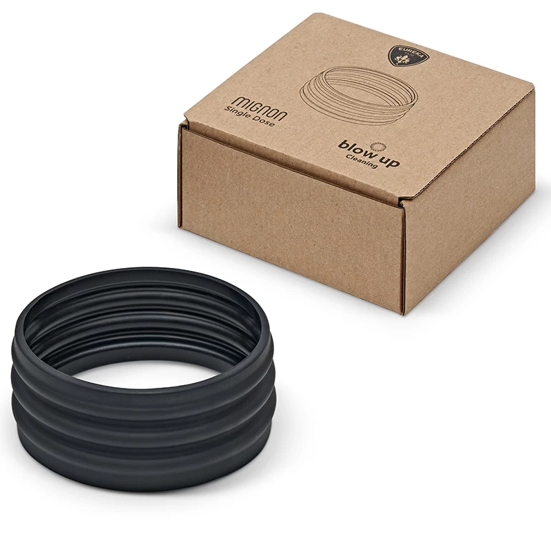 Die Eureka Mignon Single Dose Blow Up Cleaning Manschette ist das Originalersatzteil von Eureka, welches bei den Single Dosing Mühlen des Herstellers aus Florenz standardmäßig mitgeliefert wird. Beim Single Dosing kommt es darauf an, die Menge an Kaffeemehl zu reduzieren, die am Ende des Mahlvorgangs in der Mühle zurückbleibt. Um das zu gewährleisten, hat sich Eureka für die Möglichkeit des Ausblasens mit einem Luftstoß entschieden. Zwischen dem Bohnenbehälter und dem Deckel befindet sich der ziehharmonikaartige Kragen, welcher das Herunterdrücken des Deckels erlaubt, um einen Luftstoß durch das Mahlwerk zu generieren. Dabei soll verbleibendes Mahlgut aus der Mühle geblasen werden, sodass genau die Menge Kaffee rauskommt, die zur Vermahlung eingegeben wurde.
