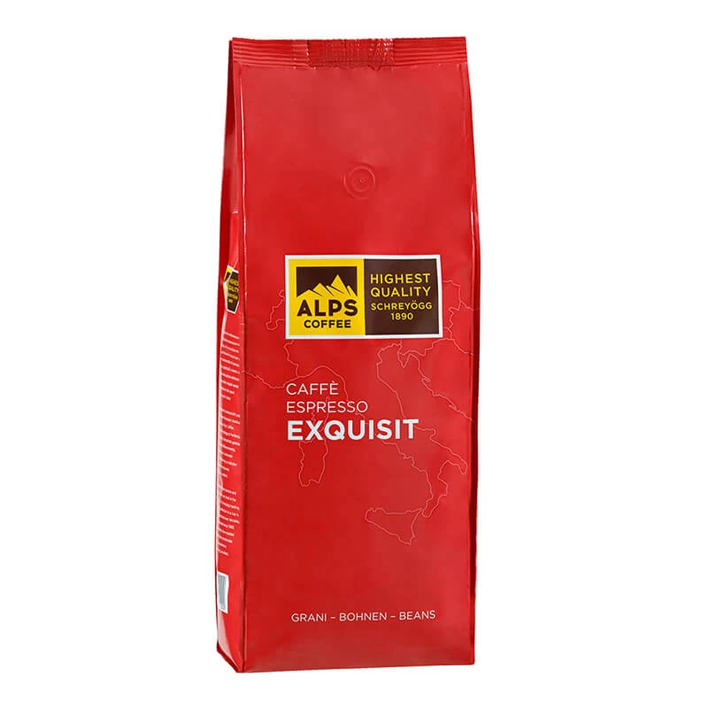 Der Espresso Exquisit von Alps Coffee besteht zu 90 % aus Arabica Bohnen und 10 % aus Robusta Bohnen. Durch die schonende und langsame Langzeitröstung werden die Bitterstoffe von den Bohnen gelöst und die Aromanoten herausgearbeitet. Der Espresso Exquisit ist kräftig und gleichzeitig mild durch die nur sehr dezenten Säuren.