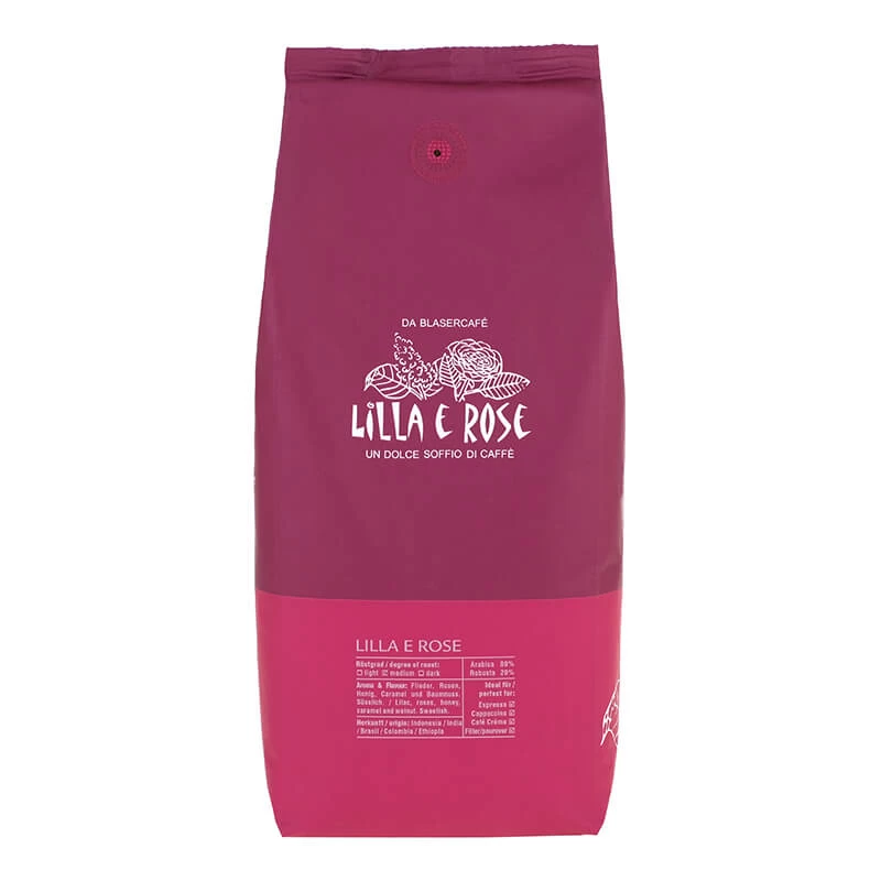 Der Blend Lilla e Rose von Blasercafé besteht zu 80% aus Arabica Bohnen und zu 20% aus Robusta Bohnen. Die Bohnen stammen aus Indonesien, Brasilien, Indien, Äthiopien und Java. Fruchtige Süße und eine leicht salzige Note ergeben das perfekte Zusammenspiel.