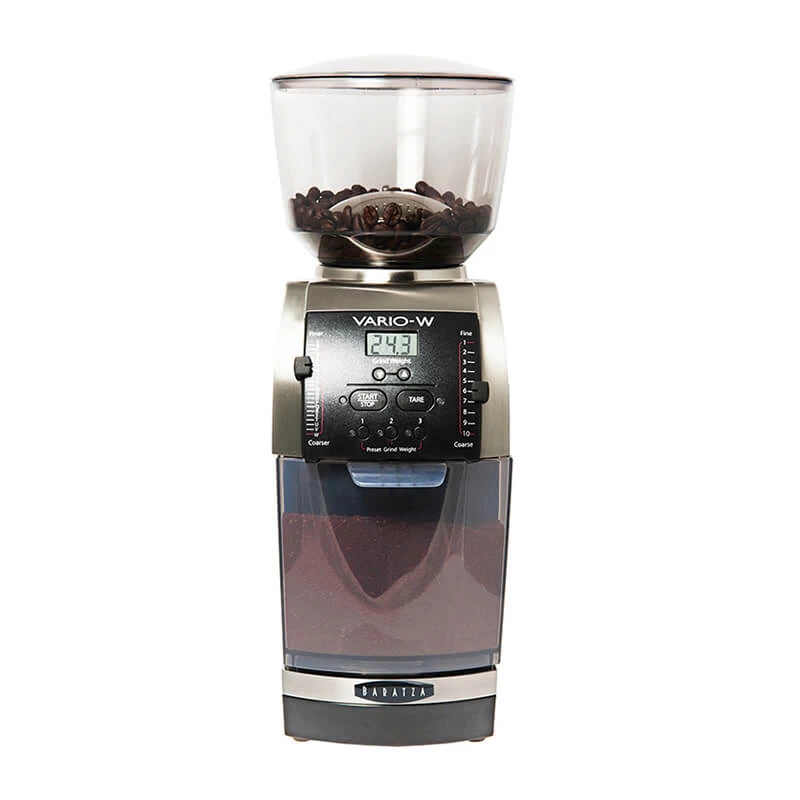Die Baratza Vario W ist eine tolle All-Round-Kaffeemühle, die vor allem durch ihre eingebaute Präzisionswaage mit einer Genauigkeit von 0,1 Gramm besticht. Der große Vorteil dieses Systems liegt darin, dass die Steuerung der Dosierfunktion tatsächlich auf der gewünschten Dosis in Gramm basiert und direkt eingegeben wird – super intuitiv. Das sonst übliche Dosieren über einen Timer wird spätestens dann ungenau, wenn die Mahlgeschwindigkeit durch verschiedene Faktoren abweicht. Gründe dafür können Wechsel von Mahlgrad und Bohnensorte, aber auch ein unterschiedlicher Füllstand des Bohnenbehälters sein. All das ist mit der Vario W kein Problem – sie mahlt zuverlässig genau so viel Kaffee, wie gewünscht.